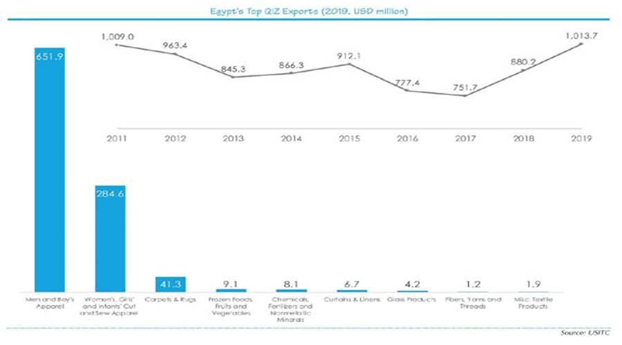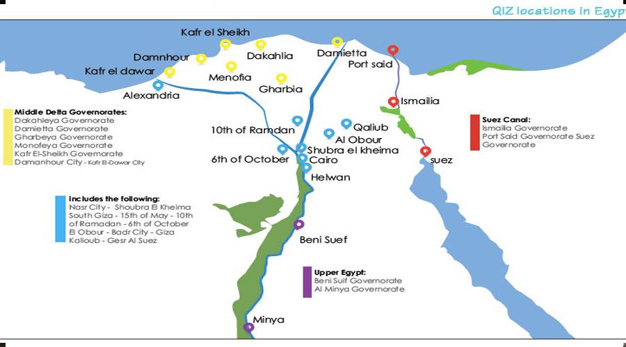 ويضيف الدكتور «إيهاب نعيم» أن هناك أكثر من 15 منطقة صناعية مؤهلة فى مصر فى القاهرة الكبرى والإسكندرية ومنطقة قناة السويس ووسط الدلتا وبنى سويف والمنيا تنتج الغالبية العظمَى من شركات المناطق الصناعية المؤهلة المنسوجات والملابس؛ لأن التعريفات الأمريكية على هذه السلع مرتفعة نسبيّا مما يجعل وضع المناطق الصناعية المؤهلة مُعفاة من الرسوم الجمركية أمرًا جذابًا بشكل خاص لهذه الصناعة، تشمل القطاعات الأخرى المؤهلة الأطعمة المصنعة والآلات والمعدات والمعادن الأساسية والكيماويات والبلاستيك والجلود ومواد البناء مثل الرخام والجرانيت.. وفقًا لغرفة التجارة الأمريكية شكلت منتجات المناطق الصناعية المؤهلة 32 ٪ من إجمالى صادرات مصر إلى الولايات المتحدة و51 ٪ من الصادرات غير النفطية فى عام 2019 بلغت صادرات المناطق الصناعية المؤهلة مليار دولار أمريكى بزيادة قدرها 15 ٪ من 880.2 مليون دولار أمريكى فى عام 2018، وشكلت المنسوجات والملابس 97 ٪ من إجمالى صادرات مصر الصناعية المؤهلة فى عام 2019 فى حين شكلت الكيماويات والمعادن والأسمدة والزجاج والمنتجات الزراعية بنسبة 3 ٪  المتبقية..