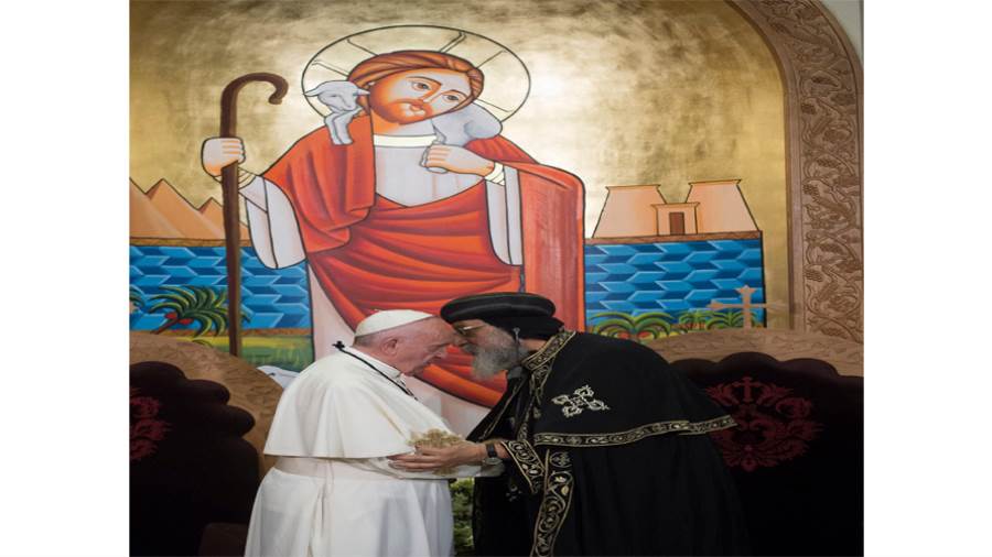 وكشف البابا أن هناك جلسة ثنائية مع بابا الڤاتيكان سيكون موضوعها مناقشة دور الكنيسة فى معالجة الأزمات والمشكلات العالمية وسلام العالم، ولا توجد أى موضوعات أخرى ستطرح للمناقشة، مشيرًا إلى أن علاقة الكنيسة القبطية الأرثوذكسية بالكنيسة الكاثوليكية بدأت ملامحها قبل زيارة المتنيح البابا شنودة، ومن أهم هذه الملامح عودة رفات مارمرقس فى عهد البابا كيرلس السادس البطريرك الـ116، مؤكدًا أنه لا يزال الطريق طويلًا للوصول للوحدة بين الكنائس لأن القطيعة استمرت نحو 15 قرنًا إلا أن العلاقات بين الكنائس تقوم على المحبة، الدراسة، الحوار والصلاة ويمكننا التعاون فى الموضوعات الاجتماعية مثل الإلحاد، وغيره، والتعاون قائم بالفعل من خلال مجلس كنائس مصر.