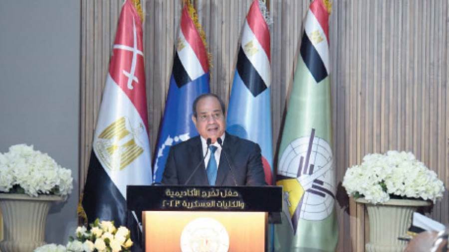 وخلال كلمته، أكد الرئيسُ السيسى أن سعادته تبلغ مَداها، ونحن نحتفل  معًا، بتخريج جيل جديد من أبناء مصر.. الذين تعلّموا فى مَدرسة العسكرية المصرية، مبادئ الوطنية والبطولة، وقيم الكرامة والعزة، وعاهدوا الله واهبين أنفسَهم للوطن، محافظيـــن علــــى أرضـــه ومقـــدرات شـــــعبه.. اختاروا أن يكونوا درع الوطن وسيفه، تسلحوا بالإيمان والعِلْم والوطنية، فى هذه الأكاديمية العسكرية العريقة.