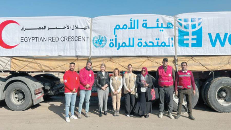 قافلة مكونة من تسع شاحنات على متنها 7 آلاف حقيبة تضم موادّ إغاثية .. هيئة الأمم المتحدة للمرأة تستجيب لمصر فى تقديم المساعدات الإنسانية للنساء والأطفال فى قطاع غزة