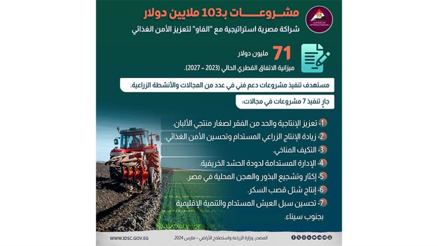 وتتركز مستهدفات البرنامج الجديد فى تنفيذ مشروعات دعم فنى فى عدد من المجالات والأنشطة الزراعية، والتى يجرى حاليا تنفيذ 7 مشروعات منها فى إطار الاتفاق مع «الفاو» لتعزيز الأمن الغذائى فى مصر، ومن أهم تلك المشروعات تعزيز الإنتاجية والحد من الفقر لصغار منتجى الألبان، زيادة الإنتاج الزراعى المستدام، التكيف المناخى، الإدارة المستدامة لدودة الحشد الخريفية، إكثار وتشجيع البذور والهجن المحلية فى مصر، إنتاج شتل قصب السكر، بالإضافة إلى تحسين سبل العيش المستدام والتنمية الإقليمية بجنوب سيناء.