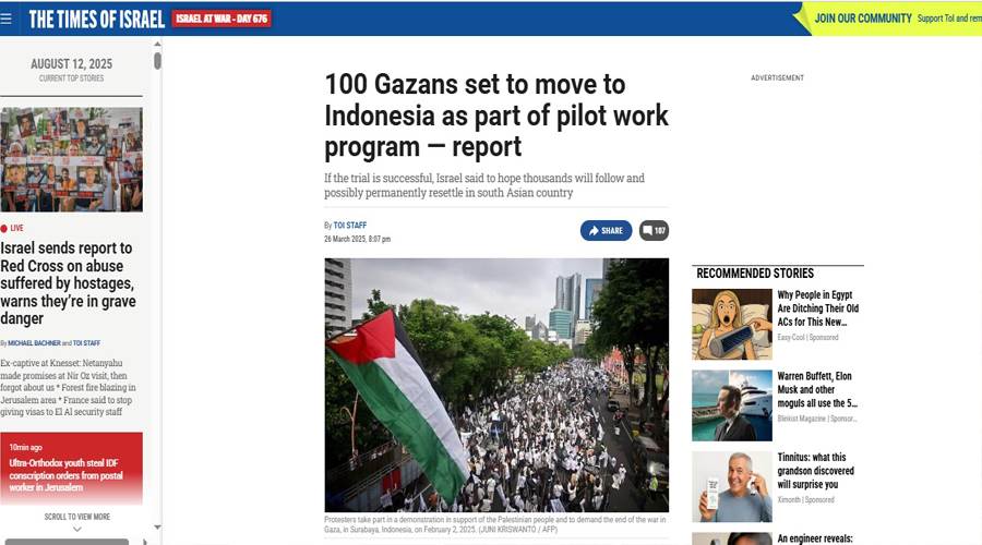 فى 26 مارس 2025، كشفت Times of Israel عن خطة لنقل أول مجموعة مكونة من 100 فلسطينى من غزة إلى إندونيسيا للعمل فى البناء، ضمن «برنامج تجريبى» لتشجيع الهجرة الطوعية، بإدارة اللواء غسان عليان، منسق أعمال الحكومة الإسرائيلية فى الأراضى الفلسطينية. الهدف المعلن: توفير فرص عمل، أما الهدف غير المعلن، فهو فتح مسار استيطان دائم خارج فلسطين، إذا نجحت التجربة.