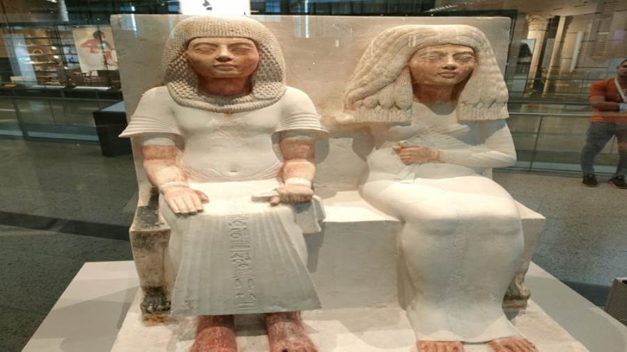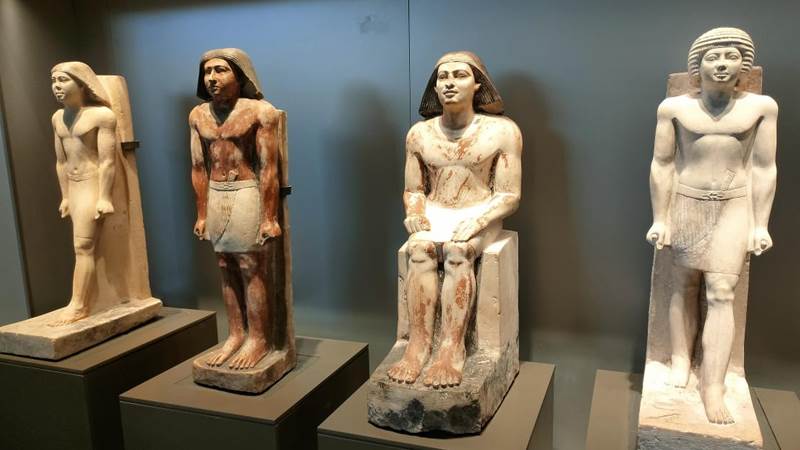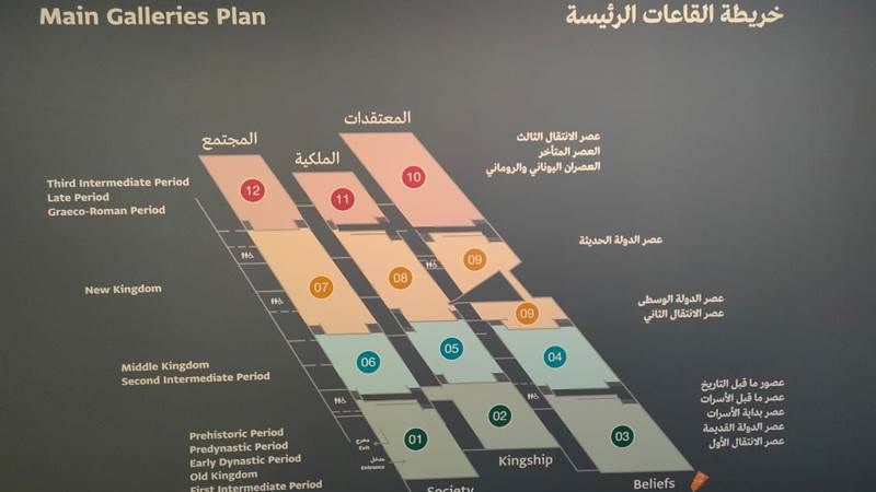 وإذا تحدثنا عن تقسيم الموضوعات طبقًا لسناريو العرض، فهى المجتمع والملكية والمعتقدات فى الحضارة المصرية القديمة، ولنبدأ بالمجتمع «قاعات 1 و6 و7 و12»، ويبدأ من عصر ما قبل التاريخ وعصر ما قبل الأسرات وعصر بداية الأسرة القديمة وعصر الانتقال الأول، وهذه الحقبة التاريخية تتحدث عن الحياة المستقرة فى وادى النيل مما أدى إلى النمو السكانى، واستخدمت المجتمعات المنتجة للغذاء أدوات مختلفة مثل أدوات الصيد والزراعة وصناعة الأوانى المختلفة، وتم توحيد البلاد فى عصر بداية الأسرات، وقد حكم ملوك مصر الأوائل مصر فى العاصمة منف خلال عصر الدولة القديمة، وتتناول المعروضات فى هذه القاعات الانتقال إلى حياة الاستقرار والابتكارات والنخبة الملكية.