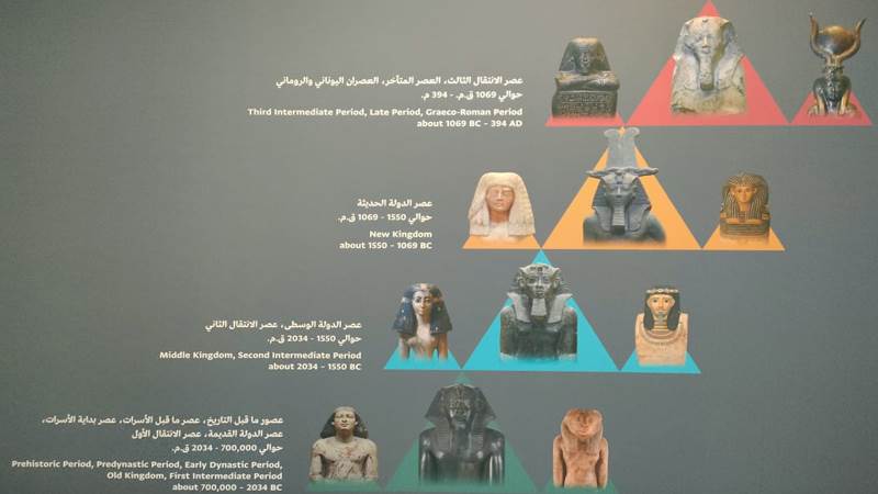 والقاعات تبدأ من عصر ما قبل التاريخ عصر ما قبل الأسرات، عصر بداية الأسرات، عصر الدولة القديمة، ثم عصر الانتقال الأول نحو 700٫000 سنة إلى 2034 قبل الميلاد، وعصر الدولة الوسطى عصر الانتقال الثانى نحو 1550-2034ق م، عصر الدولة الحديثة نحو 1550 إلى 1069 قبل الميلاد، ثم تنتهى قاعات العرض بعصر الانتقال الثالث العصر المتأخر العصر اليونانى ويبدأ نحو 1069 قبل الميلاد إلى 394 ميلادى.