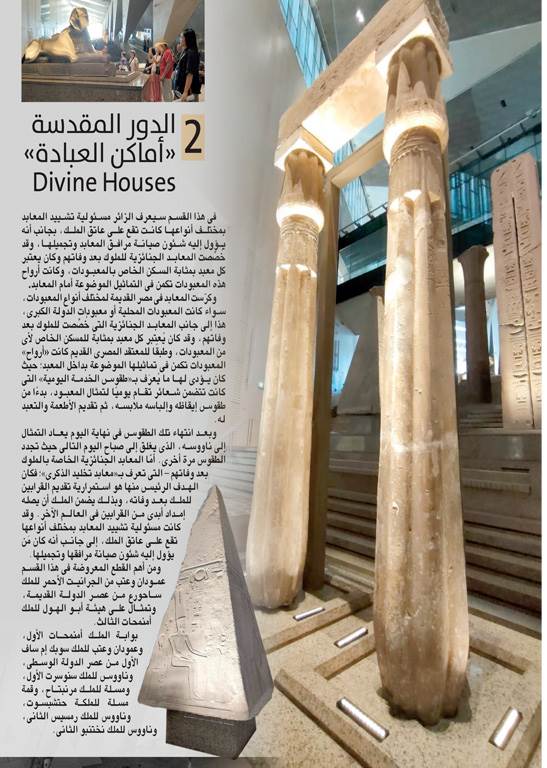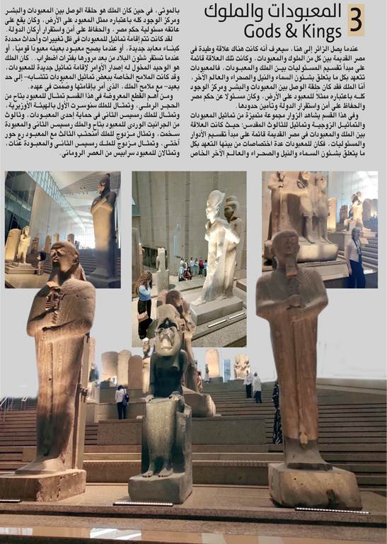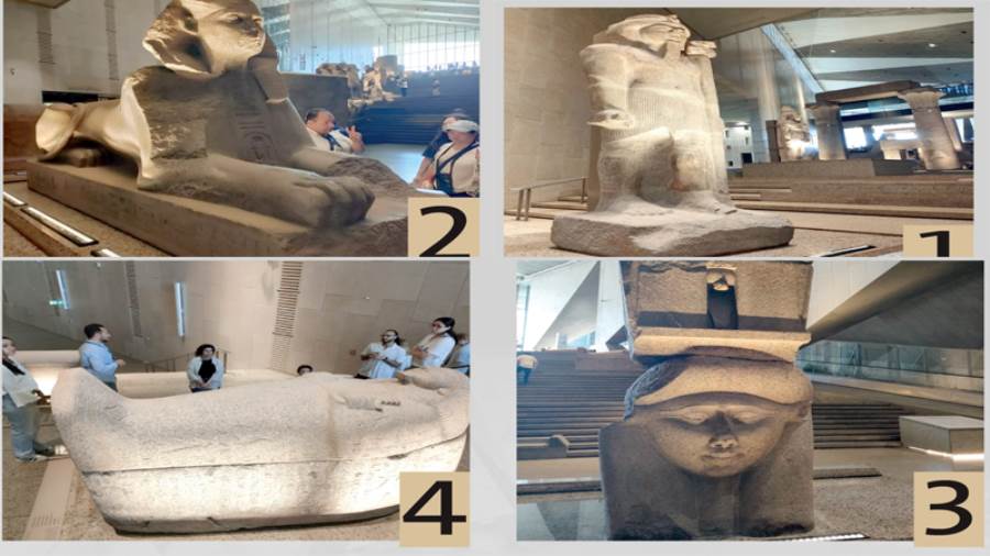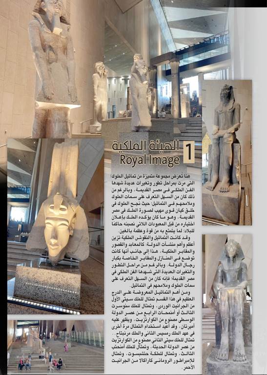 وعلى الدرج العظيم تُعرَض 60 قطعة أثرية ضخمة متنوعة ما بين تماثيل وتوابيت وغيرها، ولكى تتخيل حجم المكان قبل زيارته؛ فإن الدرج العظيم يتكون من 105 سلالم على مساحة نحو 6500 متر مربع، ويبلغ ارتفاعه صعودًا حجم 6 أدوار تقريبًا، مما يجعله بالفعل أحد قاعات العرض التى يتميز ويتفرد بها المتحف، والتماثيل والقطع التى تُعرض عليه يمكن للزوار التجول بينها والتعرف عليها وقصة وضعها بهذا الشكل، وذلك طبقًا لسيناريو عرضها الذى يقسمها إلى 4 أقسام سنأخذكم فى رحلة للتعرف عليها.