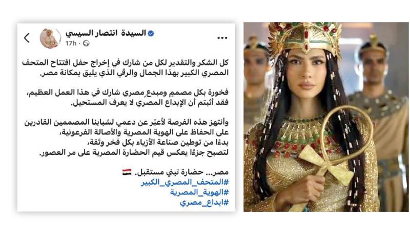 عبرت السيدة انتصار السيسى قرينة رئيس الجمهورية، عن فخرها، بكل مصمم ومبدع مصرى شارك فى حفل افتتاح المتحف المصرى الكبير، وقالت عبر صفحتها الرسمية بموقع التواصل الاجتماعى الـ«فيس بوك» فخورة بكل مصمم ومبدع مصرى شارك فى هذا العمل العظيم فقد أثبتم أن الإبداع المصرى لا يعرف المستحيل. وأضافت قرينة رئيس الجمهورية: «أنتهز هذه الفرصة لأعبر عن دعمى لشبابنا المصممين القادرين على الحفاظ على الهوية المصرية والأصالة الفرعونية بدءًا من توطين صناعة الأزياء بكل فخر وثقة، لتصبح جزءًا يعكس قيم الحضارة المصرية على مر العصور».