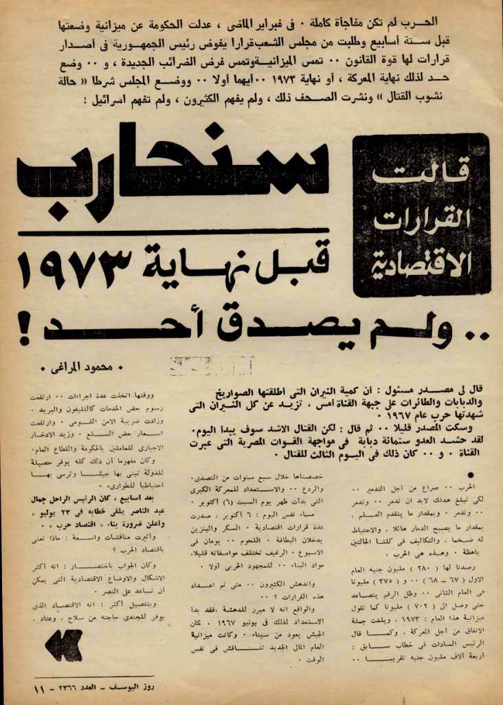 مطلوب: مراجعة شاملة لسياسة الإنتاج وسياسة الاستهلاك وسياسة التصدير، ومن الجانب المالى: إعادة النظر فى موازنة 1973، وما ورد فيها من استثمارات.