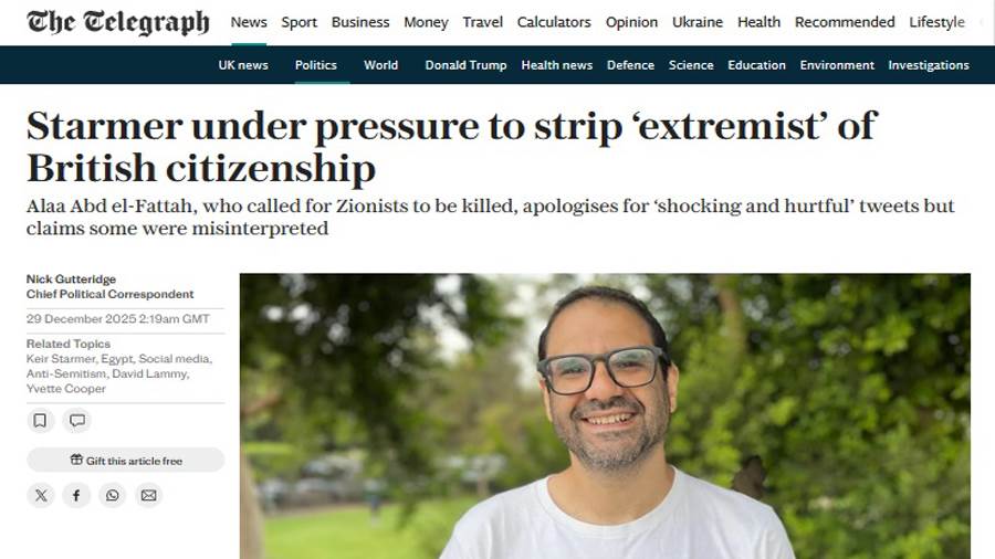 لكن هذا المسار الذى بدأ -من وجهة النظر البريطانية- منسجمًا مع خطاب الدفاع عن حقوق الإنسان، تعرّض لهزة قوية مع ظهور تغريدات تاريخية قديمة لعلاء عبد الفتاح، وُصفت رسميًا بأنها «بغيضة ومزعجة للغاية»، خاصة فى ظل حساسية السياق المتعلق بتصاعد معاداة السامية والهجمات الأخيرة ضد اليهود فى بريطانيا وحول العالم.