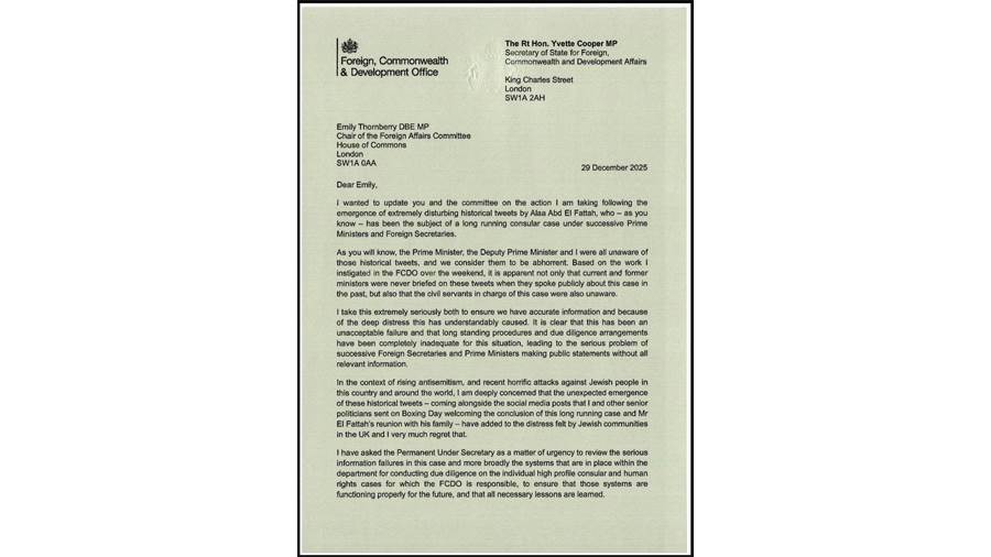 وطلبت وزيرة الخارجية من الوكيل الدائم للوزارة التحقيق فى «إخفاقات المعلومات الخطيرة» فى القضية، إلى جانب مراجعة أوسع لأنظمة التدقيق فى جميع القضايا القنصلية وملفات حقوق الإنسان البارزة، لضمان عدم تكرار ما حدث مستقبلًا، سواء فى إحاطة الوزراء أو فى المعلومات التى تُقدَّم للنواب داخل البرلمان.