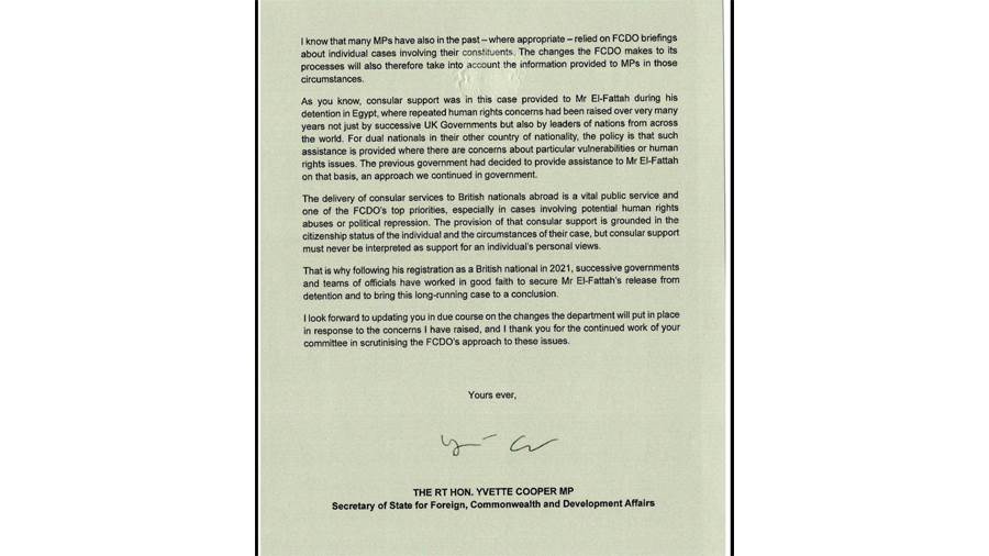 فى خطاب رسمى موجّه إلى رئيسة لجنة الشئون الخارجية بمجلس العموم، النائبة إميلى ثورنبيرى، أقرت وزيرة الخارجية والكومنولث والتنمية، إيفيت كوبر، بوجود «فشل غير مقبول» داخل وزارتها فى التعامل مع تلك القضية.
