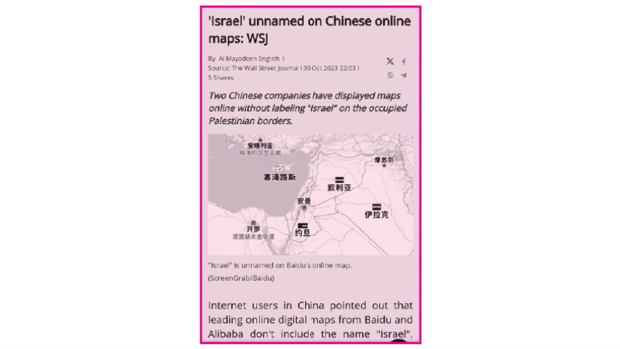 وقال جوناثان تشينج، مدير مكتب الصين  فى وول ستريت جورنال، فى تغريدة على «إكس»: «أعرب مستخدمو الإنترنت الصينيون عن حيرتهم لأن اسم «إسرائيل» لا يظهر على الخرائط الرقمية من بايدو وعلى بابا، وهو غموض يتطابق مع دبلوماسية بكين الغامضة ويتناقض مع اهتمامها العام بالخرائط». وفقا لما ذكرته الصحيفة.